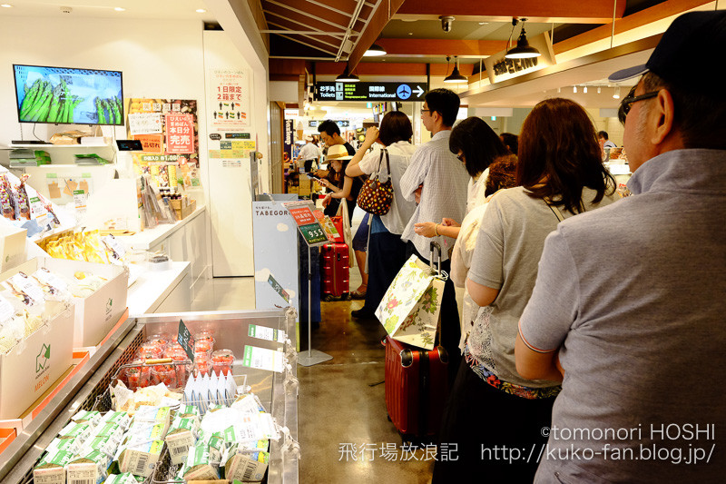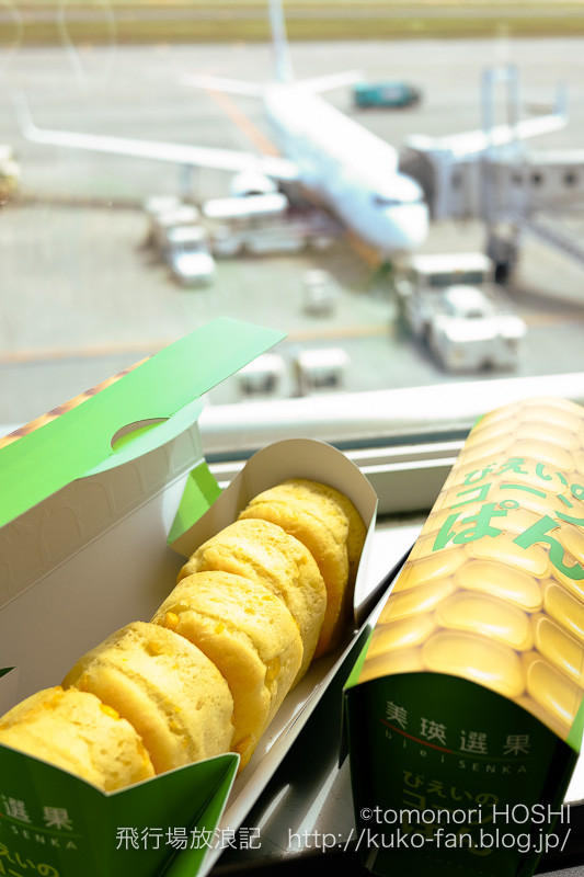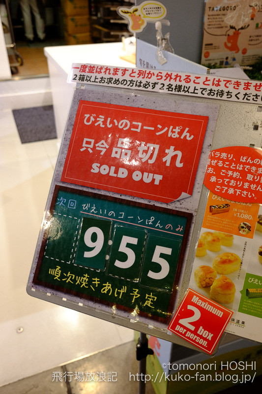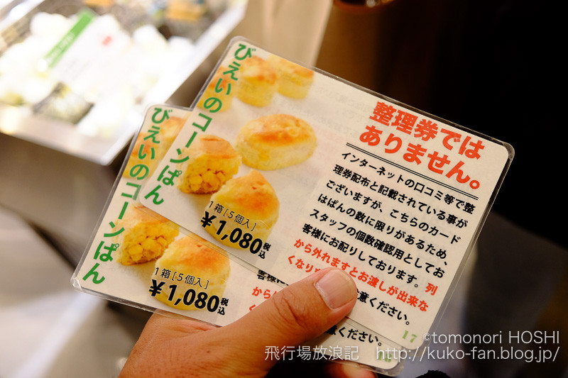 新千歳空港でいつも列ができているところというと、えびそばの一幻、焼きたてチーズタルトが人気のきのとや、そして空港限定びえいのコーンパンを販売しているJAびえいの美瑛選果あたりが印象に残ります(あ、あと手荷物を預けるカウンターはいつも長蛇の列ができてますが)。