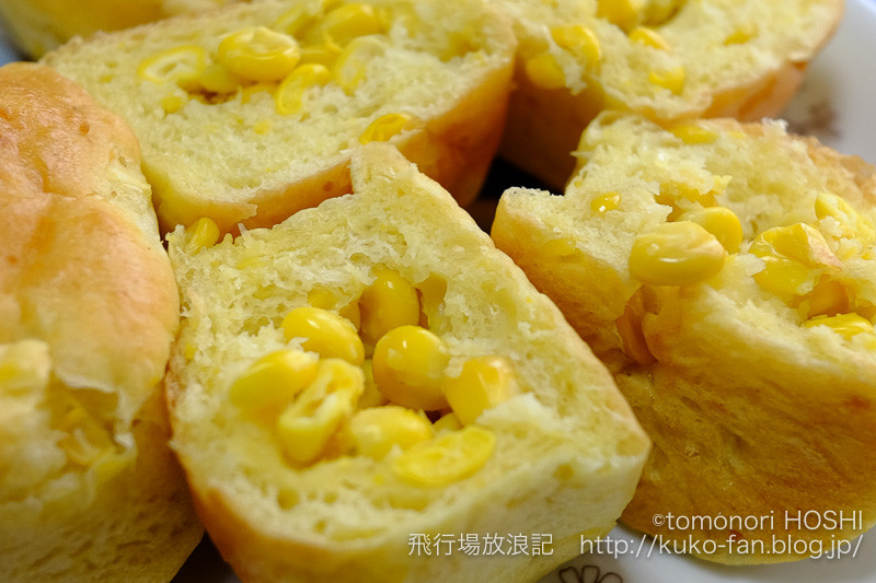 握りこぶしよりもやや大きいぐらいのパンを割ってみるとこぼれんばかり、というかこぼれてしまうほどのとうもろこしの粒が。菓子パンのような味付けはないのですが、素材の味が生きていてぱくぱく食べられます。パンの生地もモチモチしてて普通のパンとはちょっと違う特別な感じ。たしかに美味しいです。店頭にあった牛乳といっしょでもいいし、クリームシチューとかと食べると合いそうですが、この暑さではちょっとシチューを作るはしんどいのでやめました。