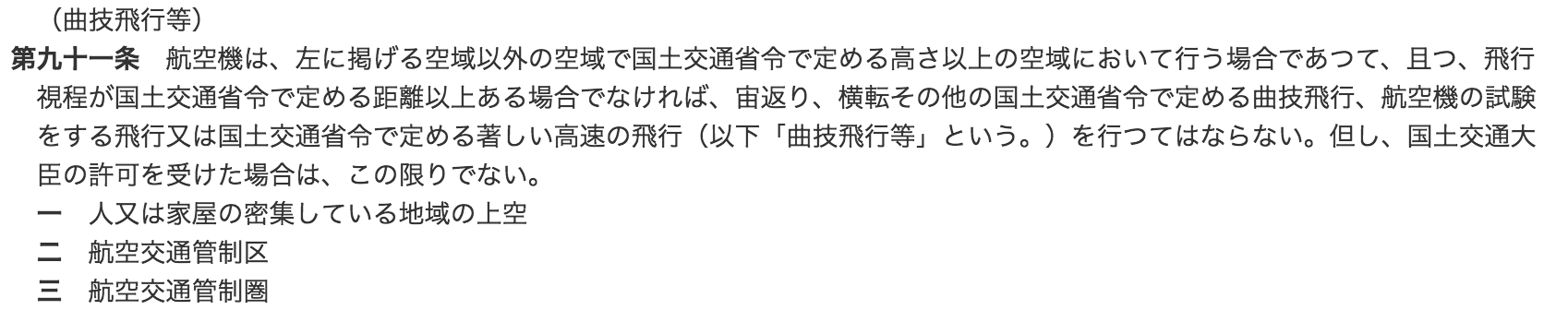 住民が、基地周辺が人口密集地にあたるのに許可を得てなかったとしているのは、この条文を根拠にしているのでしょう。確かに基地周辺には多くの住宅などが建ち並んでますし、そもそも飛行場上空は航空交通管制圏となっているので曲技飛行には国交相の許可が必要です。