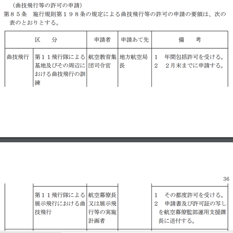 おおもとの文書でページをまたいでいたものをそのままキャプチャしたのでやや見づらいですが、ブルーインパルスが所属する第11飛行隊が展示飛行で曲技飛行を行う場合は、航空幕僚長か展示飛行等の実施計画者が地方航空局(東京と大阪のどちらか)に許可の申請を行い、申請書と許可証の写しを航空幕僚監部運用支援課長に送付する、とあります。