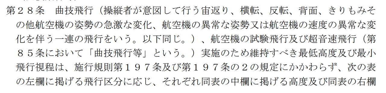 まず、曲技飛行とはなんぞや、という点ですが、航空法施行規則にはこうあります。