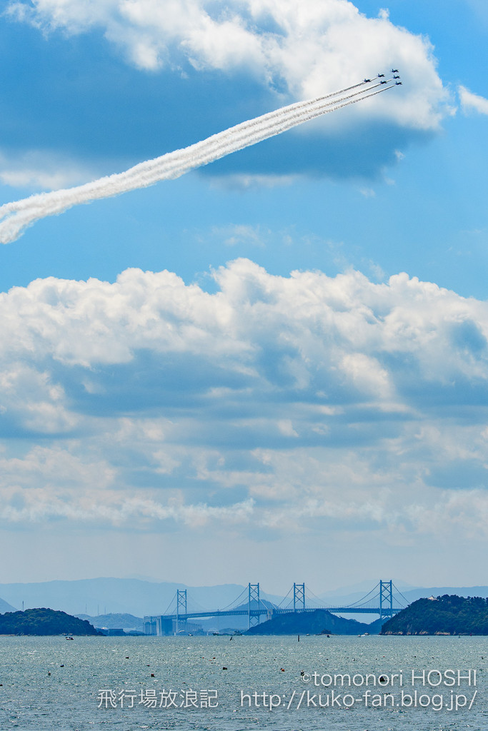 2018-04-08 瀬戸大橋開通30周年記念でブルーインパルスが展示飛行 ブルーインパルス 航空祭・航空イベント Share on Tumblr 2018年度のブルーインパルス最初の展示飛行は、岡山県児島で開催された瀬戸大橋開通30周年記念行事。前日の予行は悪天候で天候調査のみで終わったようですが、本番は晴れ。しかし離陸する小松空港の天気が悪かったようで、15分遅れて開始。デルタローパスとフェニックスローパスを披露して小松基地へと帰投しました。瀬戸大橋をどうやって絡めるか、そして人がさほど多くなさそうなところはどこかと考えてたら、こんな写真になりました。